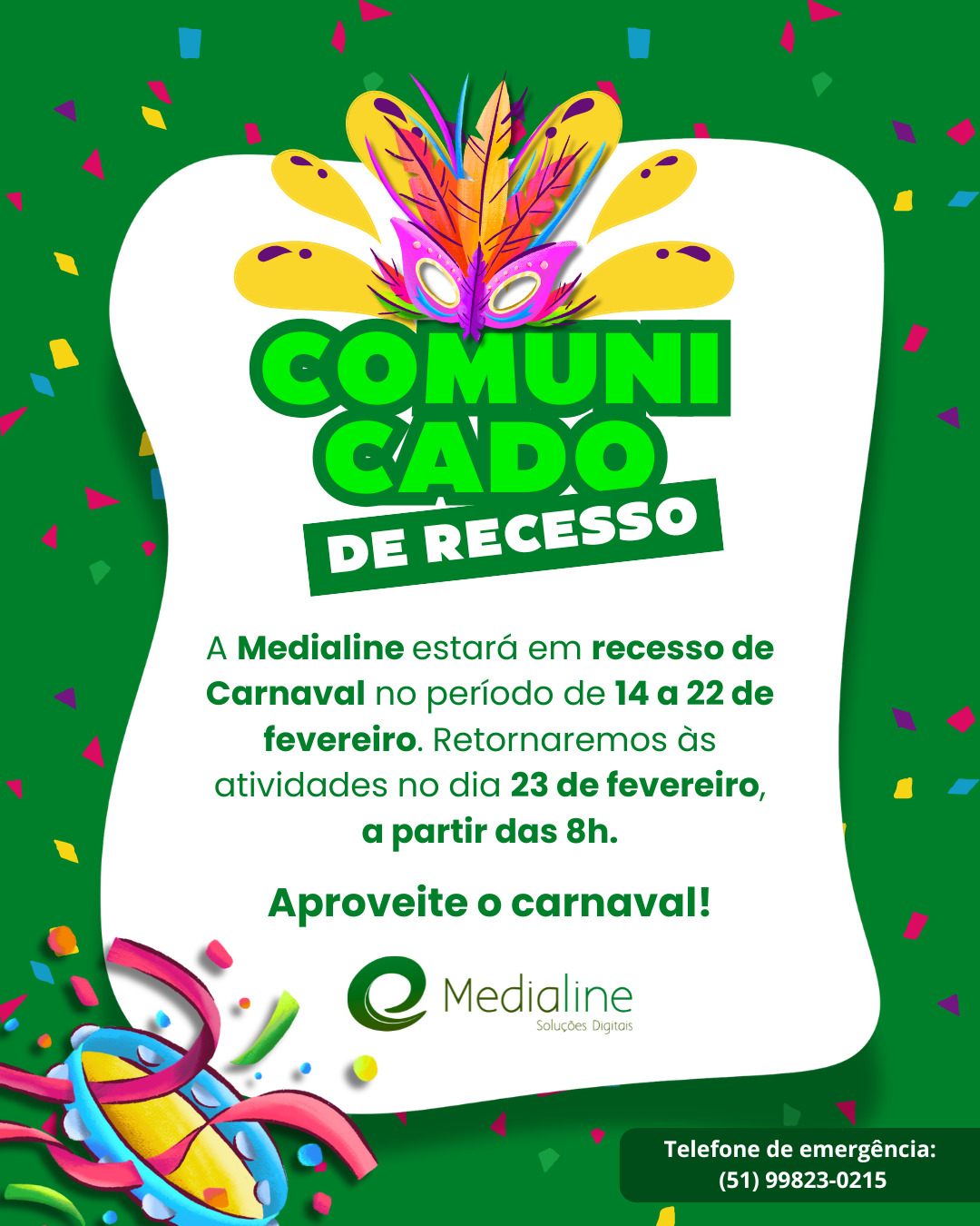 Comunicamos que devido ao feriado de carnaval estaremos de recesso a partir de 28/02/2025 (segunda-feira) até o dia 10/02/2025 (segunda-feira) as 8h15, quando retornaremos às atividades normais.